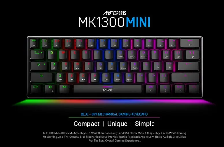 The ANT ESPORTS MK1300 is a compact, mini mechanical gaming keyboard designed for gamers who value precision, portability, and responsive keystrokes. Equipped with Outemu Blue switches, it delivers tactile and clicky feedback, ideal for fast-paced gaming.