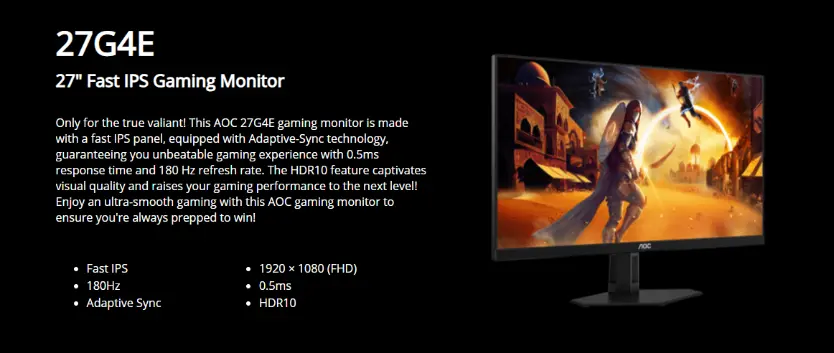 Experience ultra-smooth gameplay and vibrant visuals with the AOC 27G4E 27 Inch Gaming Monitor. Equipped with a Fast IPS panel, 180Hz refresh rate, and 0.5ms MPRT response time, this monitor is perfect for competitive gaming and immersive entertainment. Enjoy HDR10 support and a wide color gamut for rich, true-to-life visuals.
