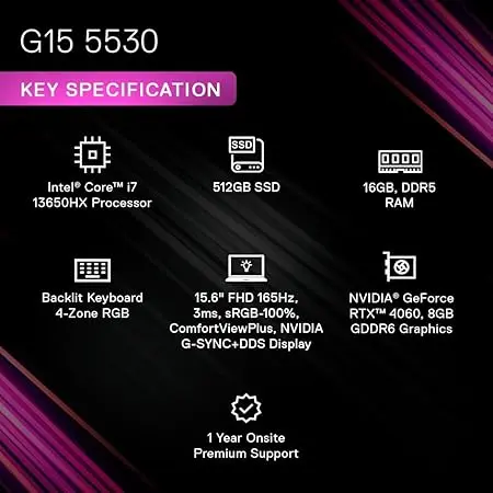 The Dell G15-5530 delivers a seamless blend of performance and style, making it a solid choice for gamers and creators alike. With Intel’s 13th Gen Core i7 processor, NVIDIA RTX 4060 graphics, and a fast 165Hz FHD display, it ensures smooth gameplay, immersive visuals, and reliable multitasking—all in a sleek Quantum White design.