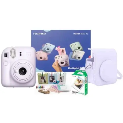 Fujifilm Instax Mini 12 Delight Box Purple, Instax Mini 12 Purple kit, instant camera bundle, Fujifilm instant camera gift set, Instax Mini 12 starter pack, Fujifilm Mini 12 with film, instant photography kit purple, Fujifilm Instax Mini 12 gift box.