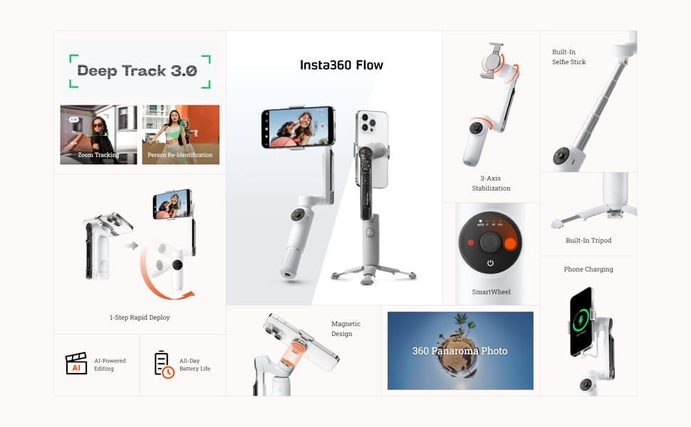 The Flow Creator Kit is perfect for creators who want intelligent tracking, smooth stabilization, and versatile filming options in one compact device. Its built-in selfie stick and rapid deploy feature make it ideal for dynamic shooting, travel vlogs, and social media content creation.