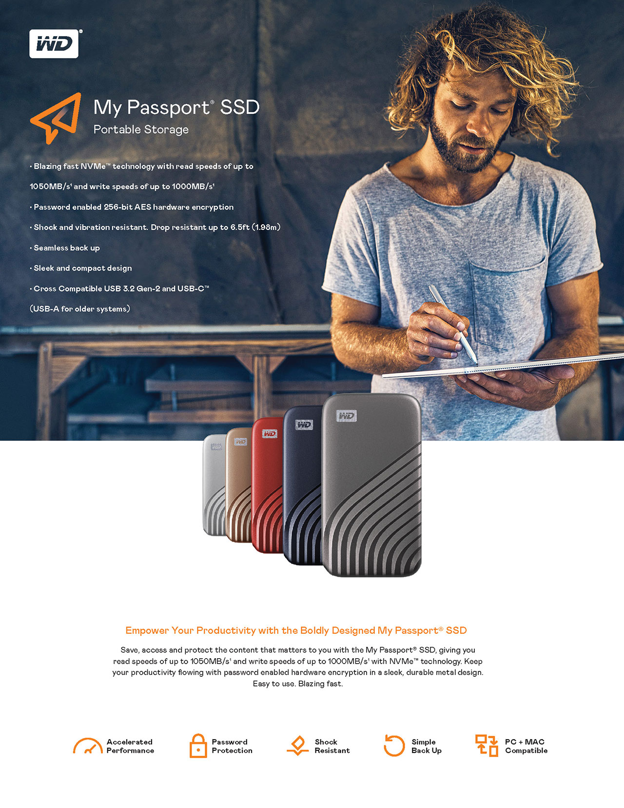 Stylishly designed in a range of colors, enclosed in a compact sleek metal design. The My Passport SSD is engineered from the ground up to be a quality drive, inside and out, to deliver reliable performance. It’s a trusted drive built with WD reliability.