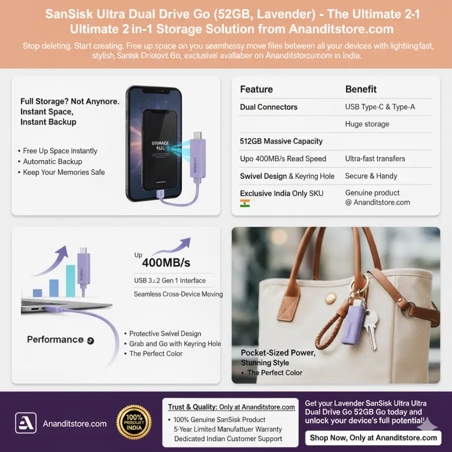 Stop deleting. Start creating. Free up space on your smartphone and seamlessly move files between all your devices with the lightning-fast, stylish SanDisk Ultra Dual Drive Go in a delightful Peach color, exclusively available at Ananditstore.com in India.