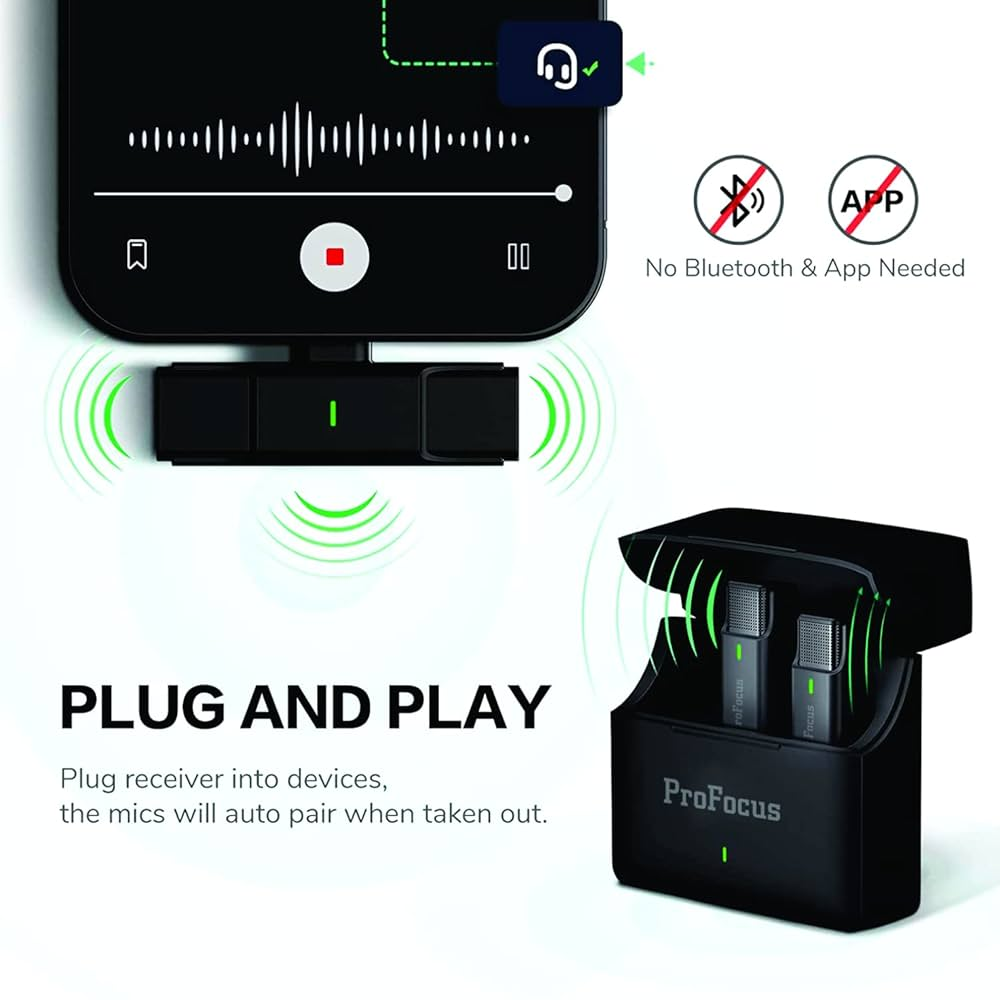 Enhance your mobile recordings with the ProFocus EP033A C-Type Smart Dual-Channel Lavalier Microphone β perfect for vlogs, interviews, podcasts, and online content.