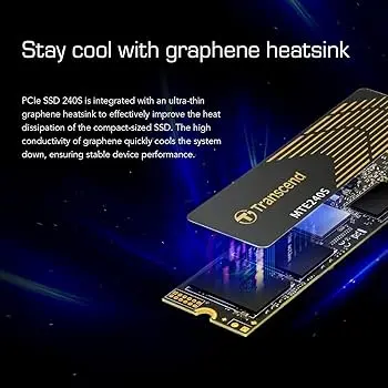 Boost your system with the Transcend TS1TMTE240S 1TB M.2 NVMe PCIe Gen4x4 SSD for fast boot times, smooth multitasking, and reliable storage, featuring DRAM cache and graphene heatsink for superior thermal performance.